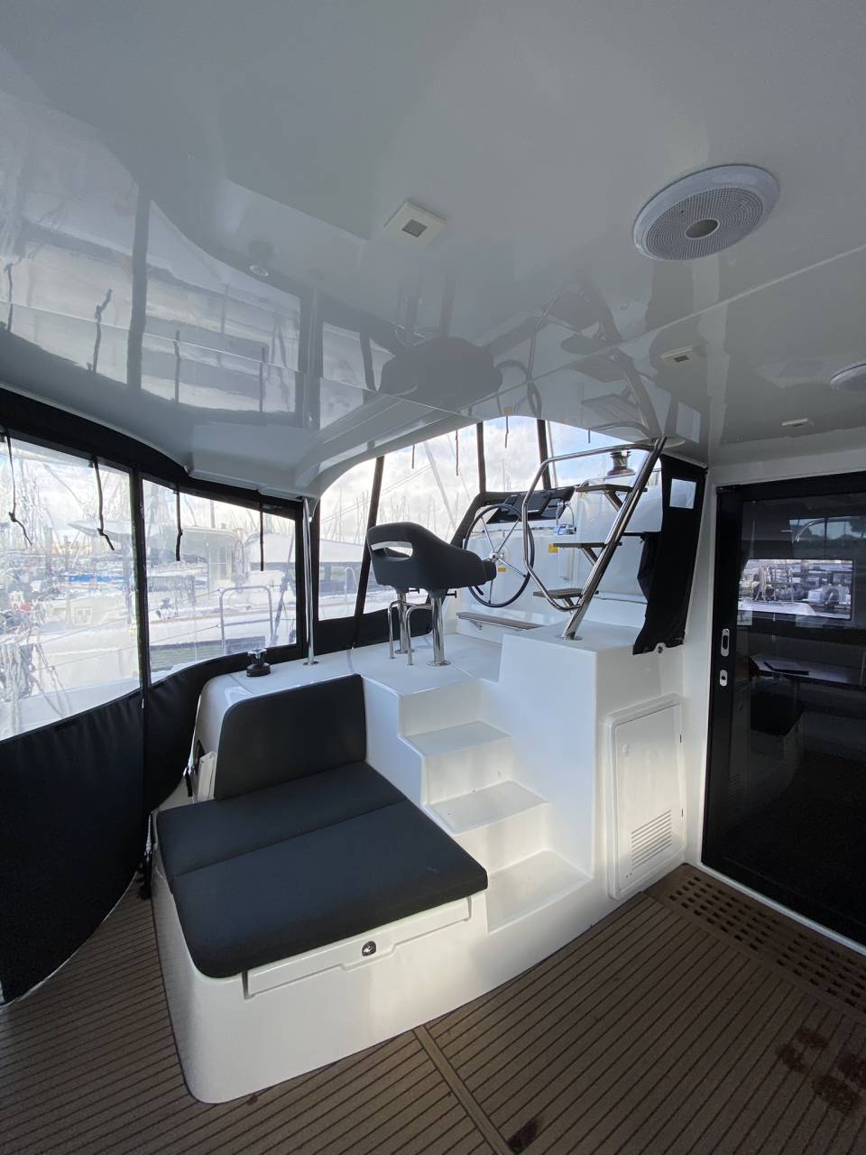 Le flybridge, situé sur le toit du catamaran, offre une vue panoramique imprenable sur les environs. C'est l'endroit idéal pour admirer les couchers de soleil flamboyants ou simplement vous détendre en contemplant l'horizon. Vous pourrez également contrôler facilement le bateau depuis cette position élevée, ce qui vous permettra de naviguer en toute tranquillité.