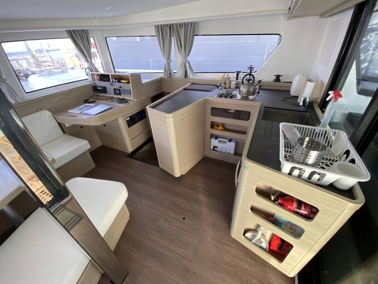 Le Lagoon 42 dispose d'un vaste cockpit extérieur qui deviendra rapidement votre espace de vie privilégié pendant votre croisière. Vous pourrez vous détendre dans les confortables sièges et canapés, profiter du soleil sur les bains de soleil ou vous attabler pour partager des repas en plein air avec vos proches. L'espace est aménagé de manière conviviale pour vous permettre de profiter de la brise marine et des paysages pittoresques de la Bretagne Sud.